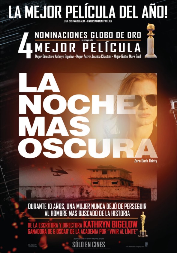 Una de las principales características de la exmujer de James Cameron es que su cine es tan testosterónico (me acabo de inventar un neologismo) como el de su marido, o más. En la ya considerable filmografía de esta mujer de físico impactante (tan atractiva como atlética) abundan las películas de acción. Acero azul y Le llamaban Bodhi podían encuadrarse dentro del thriller negro. Días extraños entraba dentro del cine fantástico. El peso del agua era un dejá vu con tensiones amorosas entre dos siglos. En tierra hostil, con la que ganó su Óscar, era un extraño film bélico que se centraba en la adicción a la adrenalina de un artificiero del ejército USA en la guerra de Irak, conflicto por el que pasaba de puntillas. Con estos antecedentes nadie podía esperar una sorpresa, salvo el título que le han puesto aquí, que remite a la mística española, de La noche más oscura, la historia de una cacería humana, la de la agente Maya, a la que la actriz del momento Jessica Chastain encarna, del hombre más peligroso de la cruzada antiterrorista, Osama Bin Laden que, no olvidemos, fue creación de la CIA.