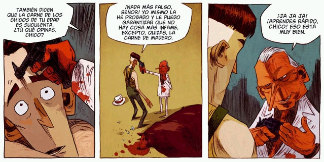 En efecto, aquel que empiece a leer las 64 páginas del álbum (una de las extensiones habituales del mercado europeo) descubrirá muy pronto que don Palermo no es ciego ni de nacimiento ni por accidente, y que su antigua asociación con el temible don Pomodoro, un gángster que estrenaba traje blanco a diario y que se enorgullecía de mancharlo de sangre antes de la puesta de sol, estaba promovida por un poderoso deseo de venganza. Un deseo provocado por un acto que para el mafioso podría resultar intrascendente pero que para el joven supondrá un antes y un después en su vida: nada más y nada menos que la pérdida de la inocencia, representada por esa piel de oso que da título a la obra y que el personaje vestirá a partir de entonces a modo de metáfora de su transformación.