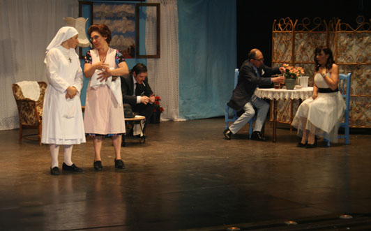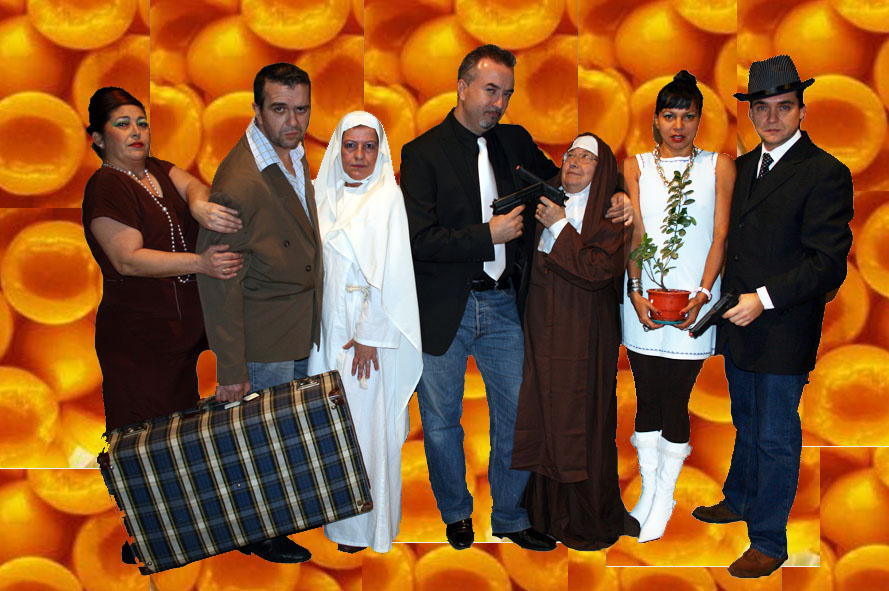 Así explicado parece que nos encontramos ante una película clásica de género negro, que podría haber sido dirigida por William Wyler, Howard Hawks o John Huston y cuyos protagonistas podrían atender a los anglosajones nombres de Humphrey Bogart, Edward G. Robinson, Robert Mitchum, Veronica Lake o Lauren Bacall, pero en realidad no estamos ante un clásico del cine «noir», sino ante una obra de teatro, los escenarios no se sitúan en Nueva York, Los Ángeles, Chicago o un cayo de Florida, en los gloriosos años 40, sino que la trama sucede en Madrid, en el verano del año 1958, los atracadores responden a los castizos nombres de Cosme, Federico, Carlos o Suárez y la vampiresa clásica no es Brigid O’Shaugnessy sino una honesta tanguista llamada Nuria. Y por supuesto la detective, porque siempre tiene que haber un o una detective, no es la cuñada de Phillip Marlowe o la hermana pequeña de Sam Spade, sino que se llama María. O mejor dicho, Sor María. Y es que estamos hablando de Melocotón en almíbar, la encantadora y deliciosa obra de teatro de Miguel Mihura.