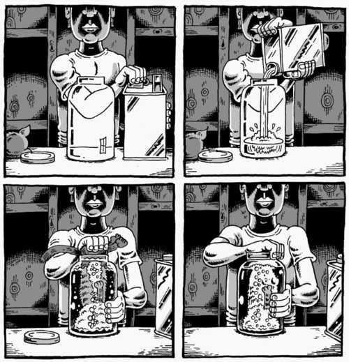 Esto se debe a que, como subraya su título, Mi amigo Dahmer es tanto una biografía, parcial pero muy significativa, del asesino en serie protagonista como una autobiografía de su autor, acompañado de sus mejores, estos sí, amigos de aquella época. En este rasgo dual radica uno de los mayores logros de una obra no precisamente carente de aciertos: la elección de la voz narradora, lejana en este caso de la asepsia característica del grueso de la narrativa de no ficción, permite que el resultado de la propuesta juegue (a ganar) en dos ligas distintas, la del ensayo histórico y la del slice of life; esto es, el relato intimista y tangencialmente autobiográfico cultivado por autores tan dispares como Jeffrey Brown, Terry Moore, Alex Robinson, Seth o los Hernandez Bros. De hecho, y como explica el propio Backderf en el texto que sirve de prólogo al volumen, la presente obra nació como un tebeo de apenas ocho páginas que generó una serie de historietas breves autopublicadas en formato comic book, como tantos y tantos otros títulos del mercado independiente norteamericano. Solo con el paso del tiempo y ante el aumento progresivo de páginas que presentaba la historia dada la obsesión del autor por su antiguo compañero de instituto, Mi amigo Dahmer adquirió las proporciones de la novela gráfica que hoy ha llegado a nuestras manos.