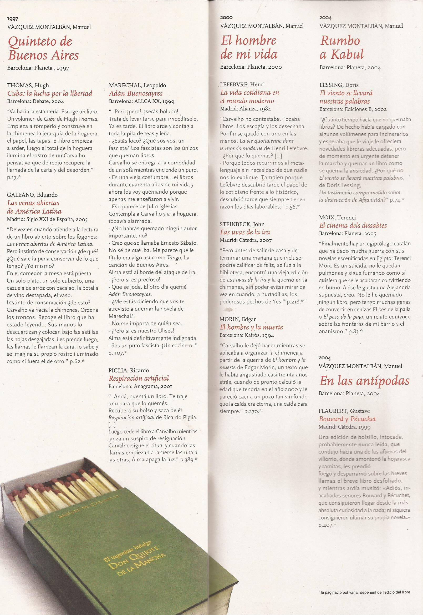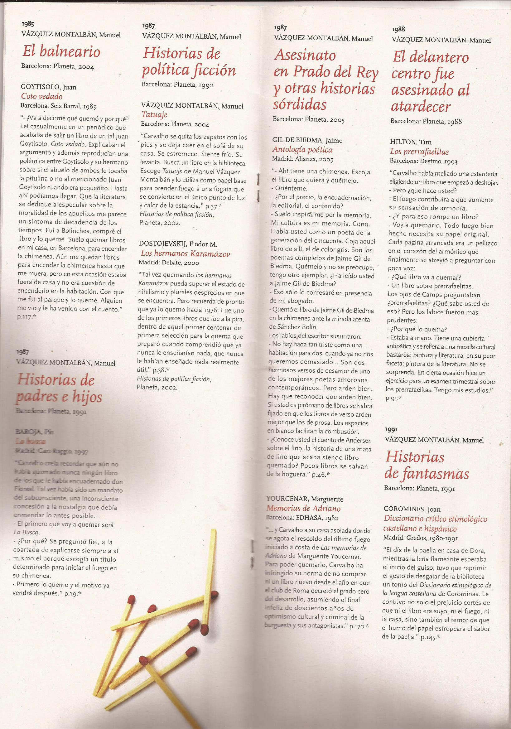 Ricardo, es un buen regalo, ya he trasladado a una carpeta que, por cierto, no es negra aunque huela a humo, de mi ordenador. Te aseguro que en mi biblioteca hay varios de esos que Carvalho utilizaba para alimentar el fuego del hogar y, de paso, provocar un poco más a los bien pensantes. Un poco más porque ya provocaba a los militantes de izquierda que se alimentaban con un pincho de tortilla o un bocata de calamares en cualquier tasca de a duro o poco más. Te aseguro que nunca los quemaré, ni siquiera el «Mi lucha» porque no lo tengo y si lo tuviera no dispongo de fuego para calentar mi casa. Para mi los libros son un elemento muy positivo. Recuerdo ahora la obra de Stefan Zweig, «Mandel, el de los libros», un alegato tan maravilloso a favor de los libros que pone los pelos de punta (a mi no que no los tengo, al menos que se vean).
