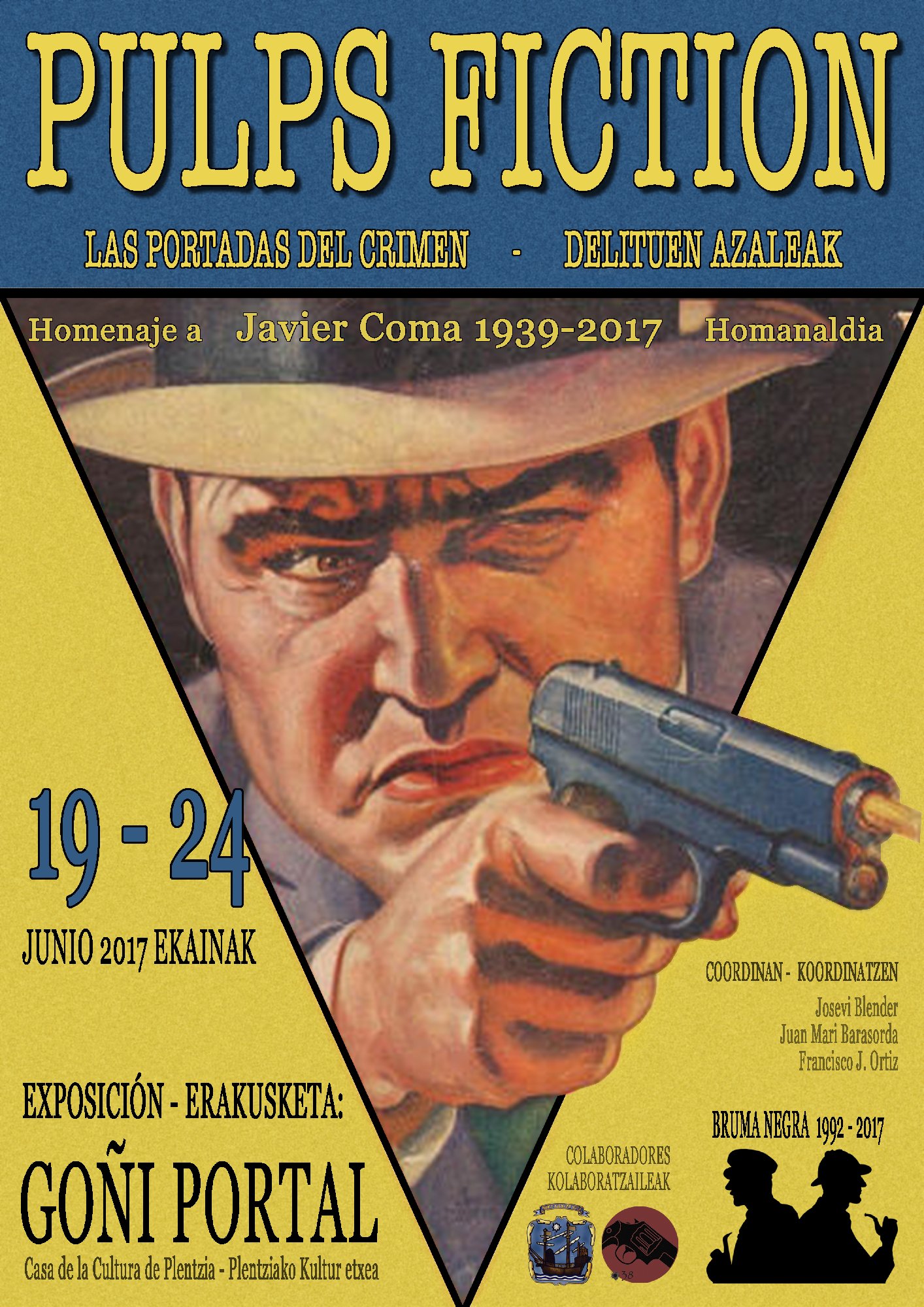 La colaboración entre el Ayuntamiento de Plentzia y la Revista Calibre .38 ha ido este 2017 (año de celebración del 25 aniversario de la puesta en marcha de los Encuentros sobre Género Negro Bruma Negra) más allá de los dos días que durarán los encuentros (23 y 24 de junio), ofreciendo a quienes se acerquen a Plentzia la semana del 19 al 24 de junio una exposición singular bajo el título PULPS FICTION (Las portadas del crimen); una exposición en la que serán protagonistas los ilustradores que dieron imagen, en las cubiertas primero y en los comic books después, a las historias de detectives y criminales que los escritores crearon en la consolidación de un género que vino en llamarse primero novela policíaca (respetando el término roman policier acuñado en Francia) y años más tarde novela negra.
