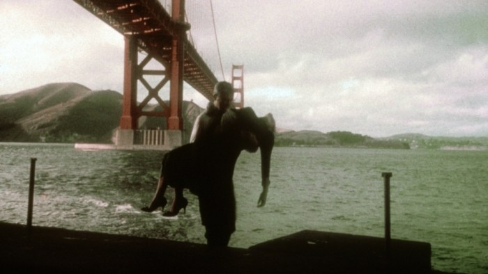 James Stewart carries Kim Novak in the shadow of the Golden Gate Bridge in a scene from Alfred Hitchcock’s Vertigo.