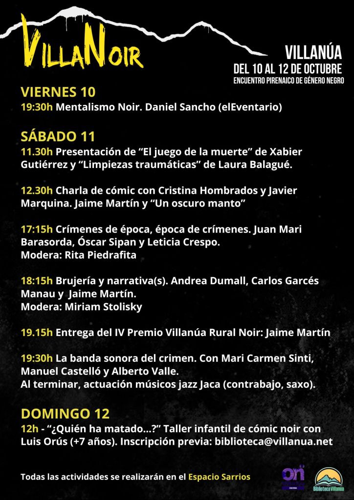 El fin de semana del 10 al 12 de octubre Villanúa volverá a convertirse en la escena de un crimen imaginario que dará rienda suelta a la imaginación, la creatividad y el talento de los creadores convocados a la IX edición de VillaNoir, el ya consolidado Encuentro Pirenaico de Género Negro. Todas las actividades se celebrarán en el Espacio Sarrios.