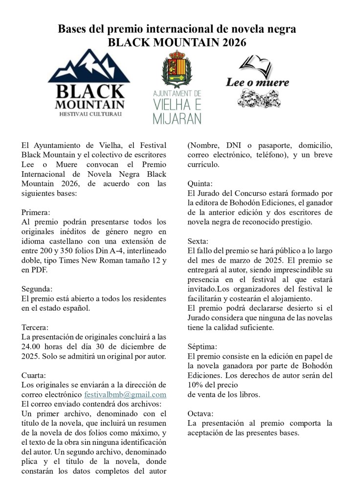 Premio Internacional de Novela Negra Black Mountain 2026. Bases revistacalibre38 / 4 diciembre, 2025 El Ayuntamiento de Vielha, el Festival Black Mountain y el colectivo de escritores “Lee o Muere”, convocan el Premio Internacional de Novela Negra Black Mountain 2026, de acuerdo con las siguientes bases: Puedes seguirnos en Bluesky y Telegram Compartir: Compartir en Facebook (Se abre en una ventana nueva) Facebook Compartir en Bluesky (Se abre en una ventana nueva) Bluesky Compartir en X (Se abre en una ventana nueva) X Compartir en WhatsApp (Se abre en una ventana nueva) WhatsApp Compartir en Telegram (Se abre en una ventana nueva) Telegram Share on Threads (Se abre en una ventana nueva) Threads Email a link to a friend (Se abre en una ventana nueva) Correo electrónico Me gusta Cargando...